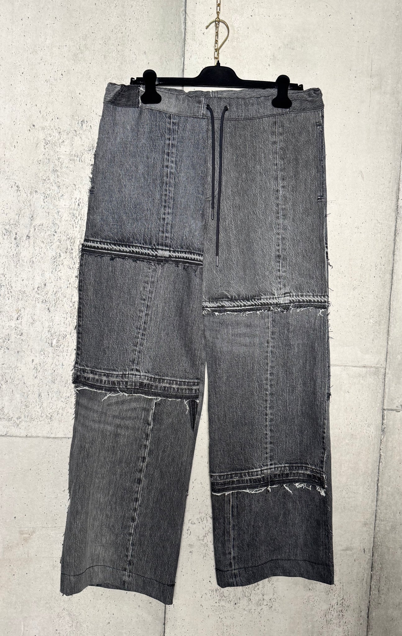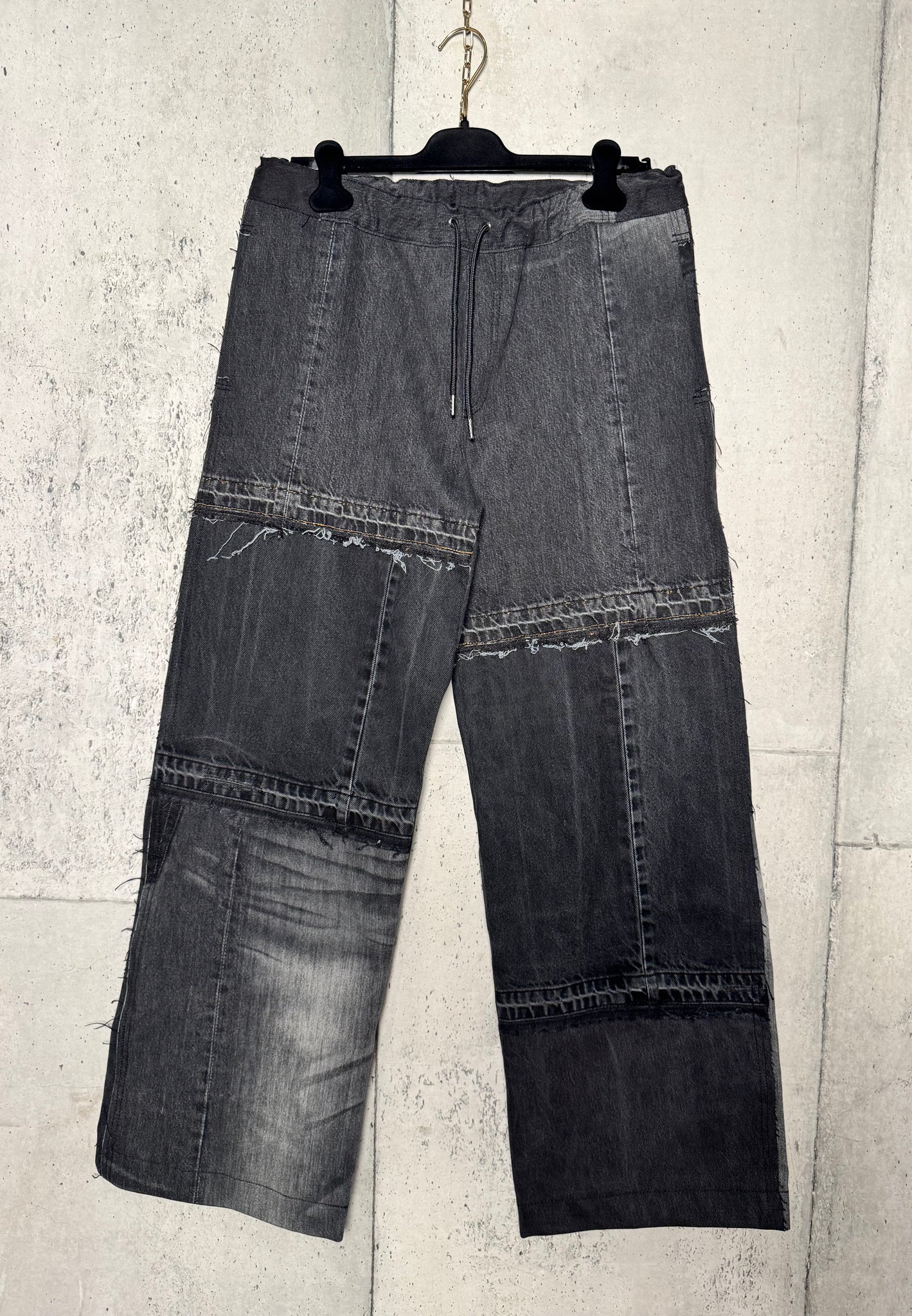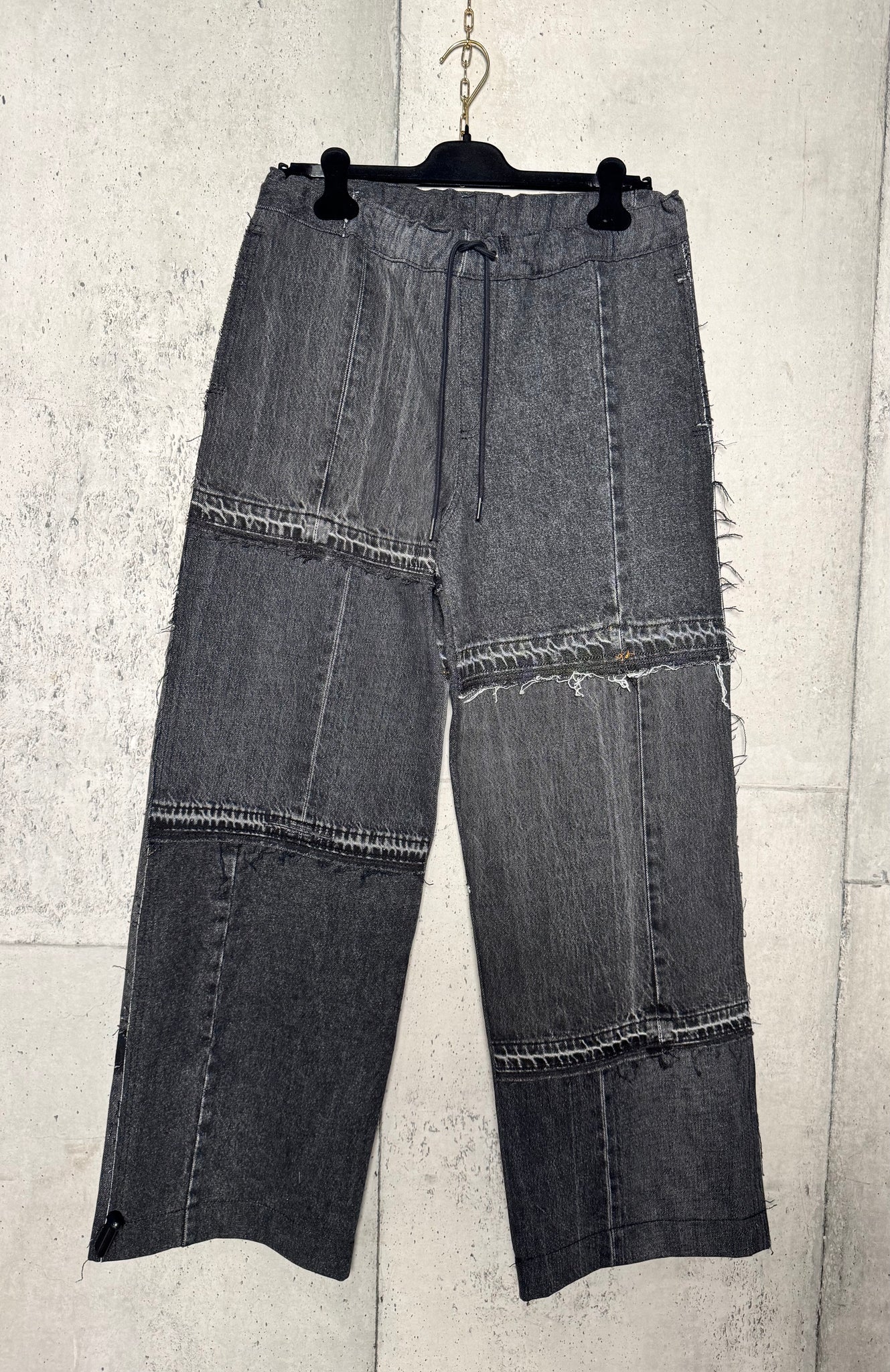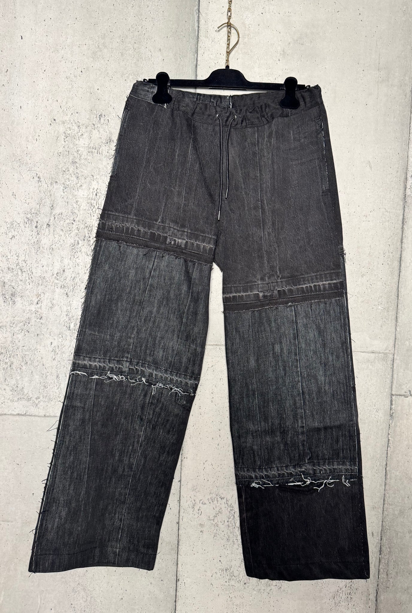Wide leg jeans by Aftur in dark wash gray. Drawstring at elasticised waistband. High waist and extra long.