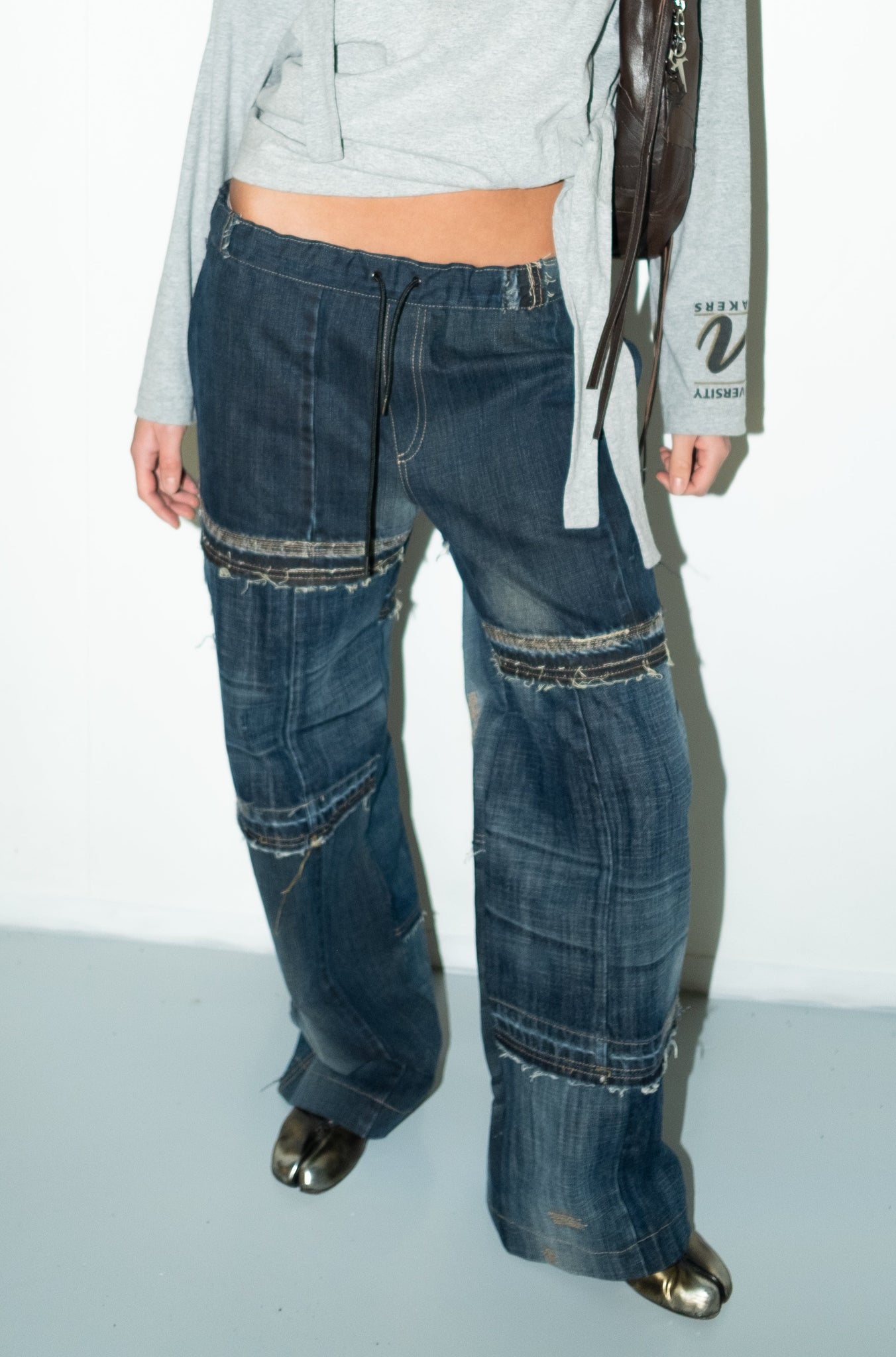 Wide leg jeans by Aftur. Drawstring at elasticised waistband. High waist and extra long.