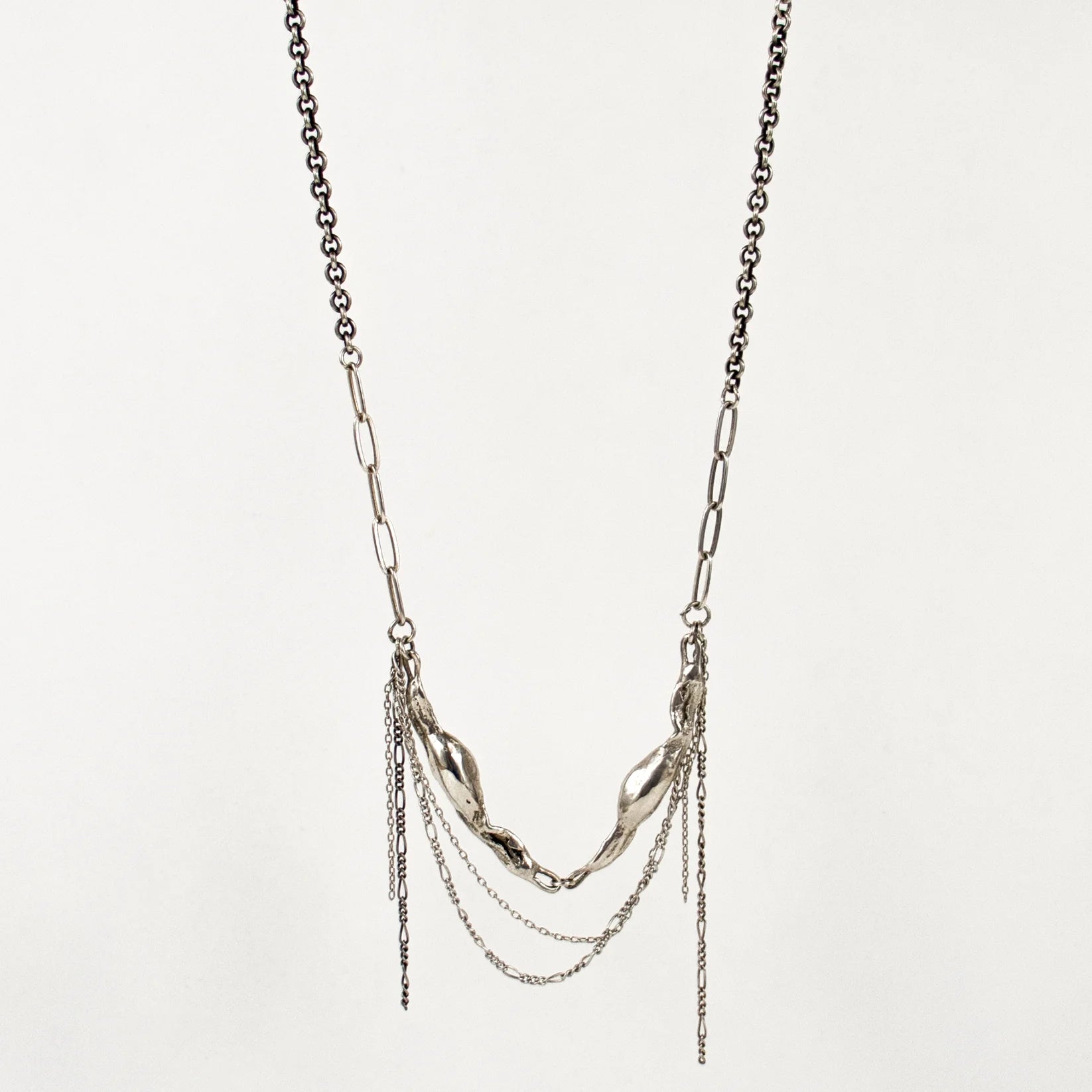 Two reclaimed sterling silver 2 inch seaweed feathers with sterling mixed-chain tassels on sterling paperclip chain adjustable 16-18 inches handmade and finished in our Catskills store-studio.