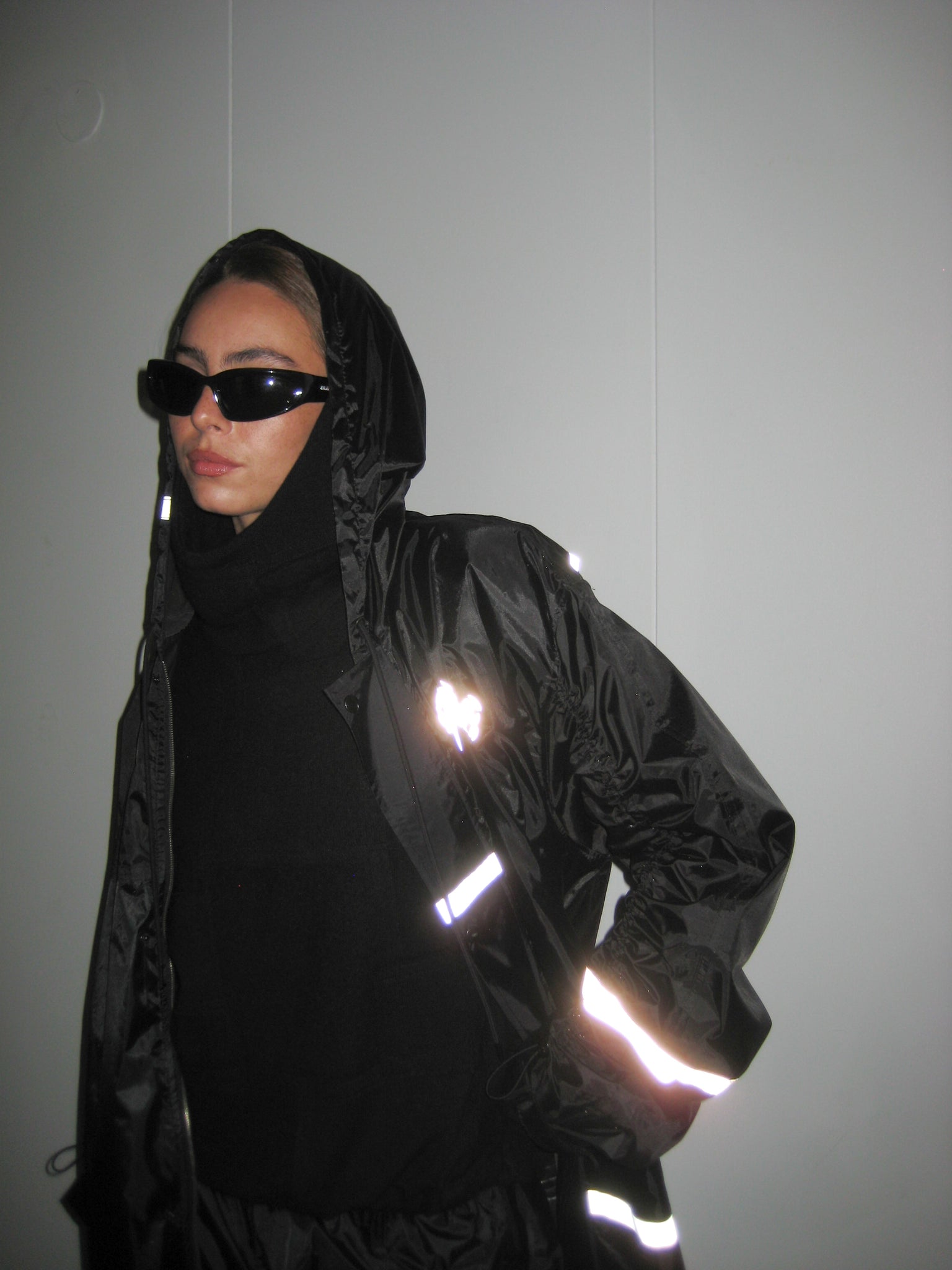 100% recycled cashmere hoodie. Features a double layered collared hood, straight body with a lined drawstring for a baggier fit.