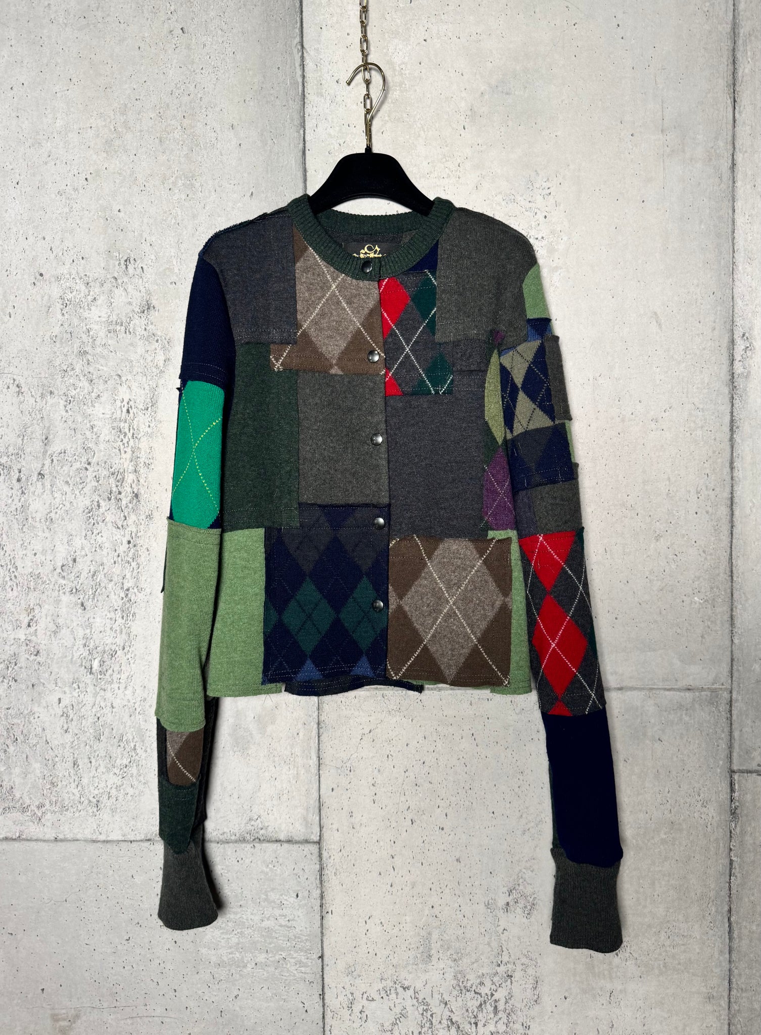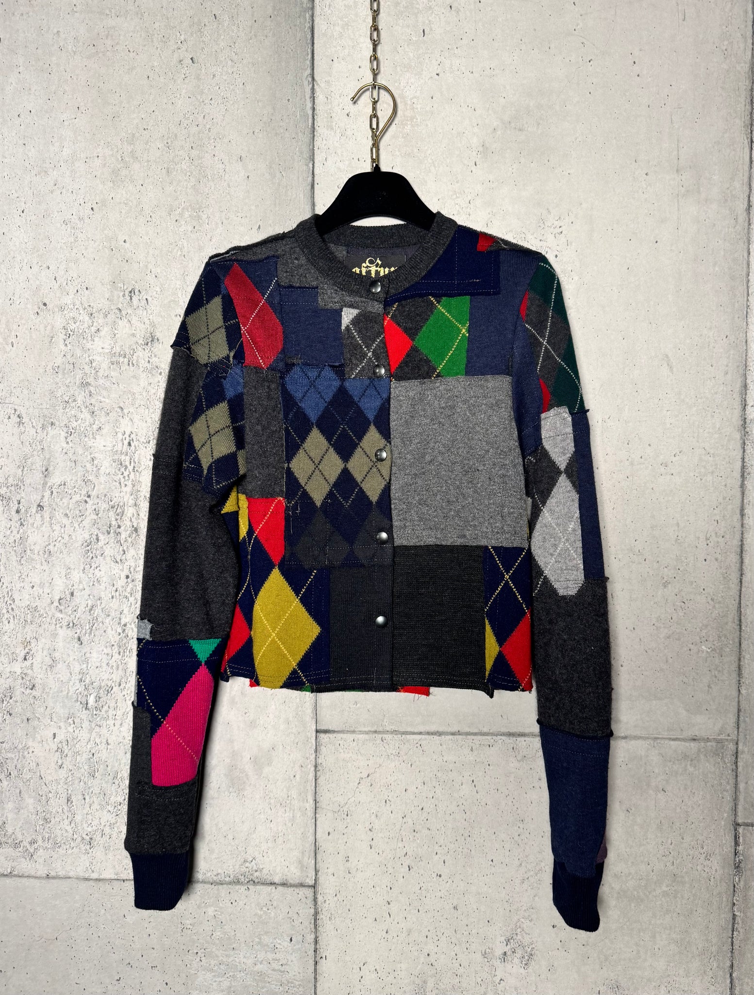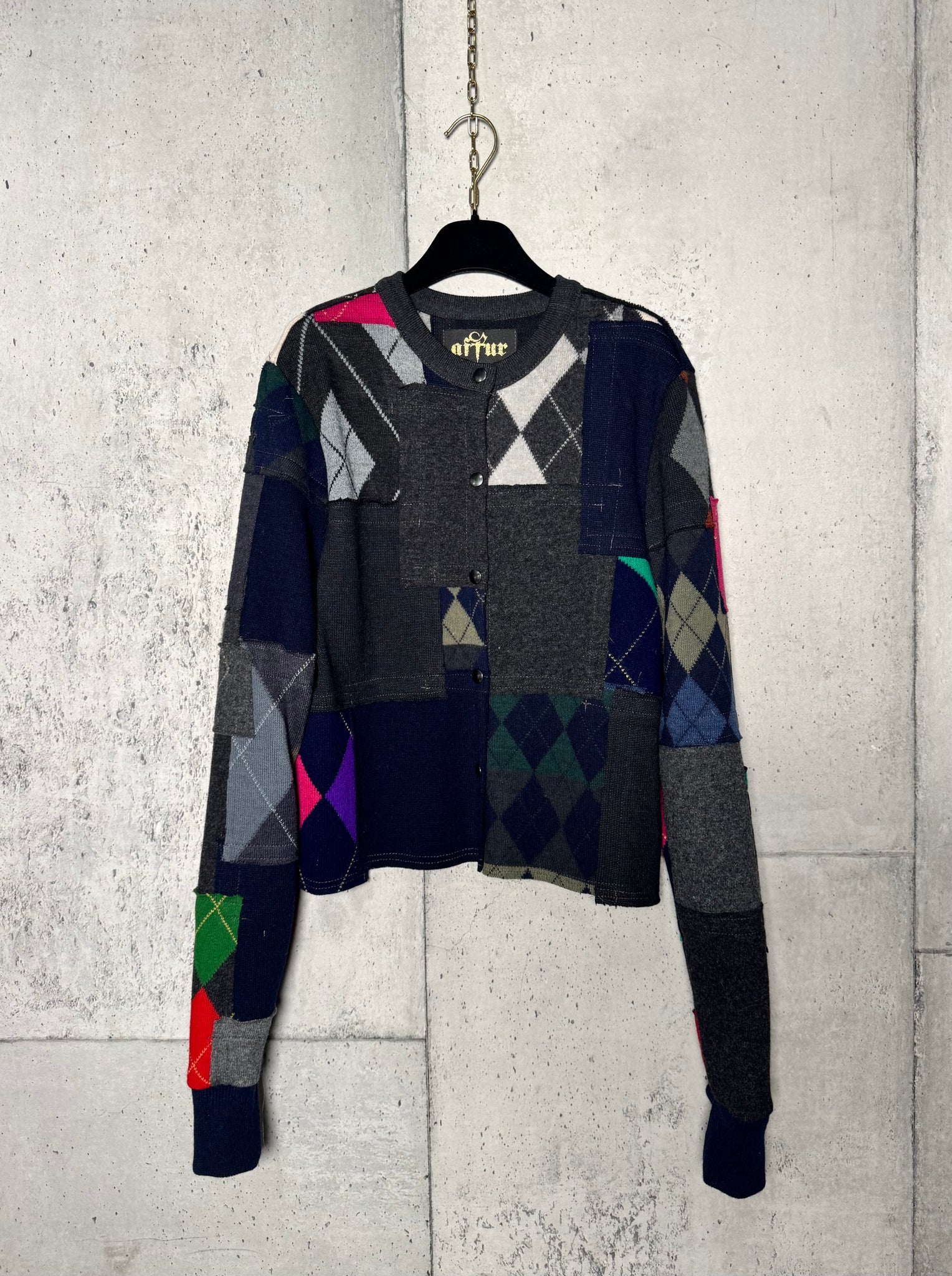 Patchwork argyle cardigan by Aftur. Long sleeves and cropped raw hem waist.