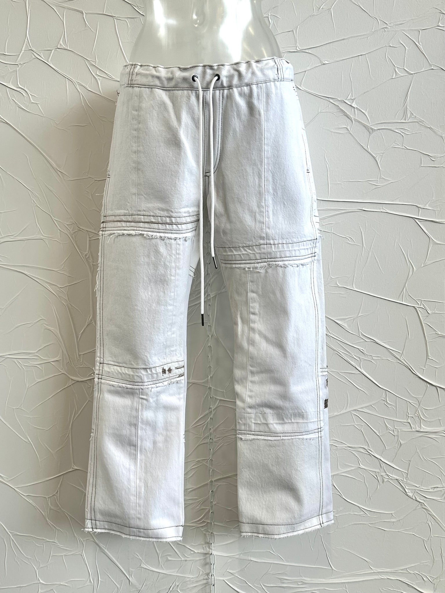 100% cotton, washed material. Shades of white and details may vary.